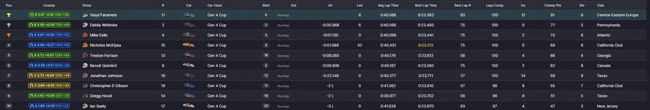 І на рестарті в боротьбі за кілька кіл я опинився 4-тим і почав наздоганяти трійку лідерів, розмотав їх по черзі. Перший і другий гарно крили інсайд, але нові шини і їхня боротьба дозволила стати мені другим, а лідера обійшов розшатавши його оборону. Я у третьому повороті зайшов широко, щоб на четвертому повороті вийти на інсайд на більшій швидкості і обійшов його так. Це було останнє коло, лишилось просто доїхати.