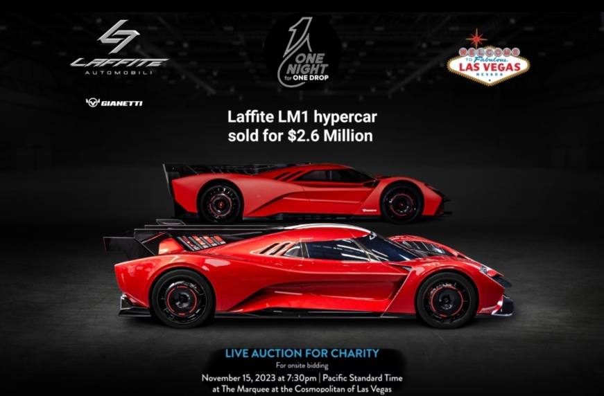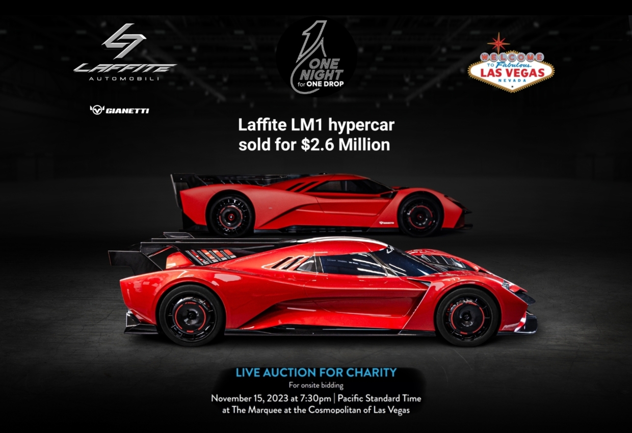 Первый из 24 запланированных гиперкаров Laffite LM1, представленный во время запуска бренда, продали за 2,6 миллиона долларов. Торги состоялись 15 ноября во время вечера «One Night for One Drop», первого благотворительного мероприятия уик-энда Формулы-1 в Лас-Вегасе. Целью организаторов был сбор средств для обеспечение устойчивого доступа к питьевой воде, санитарии и гигиене в беднейших странах мира.