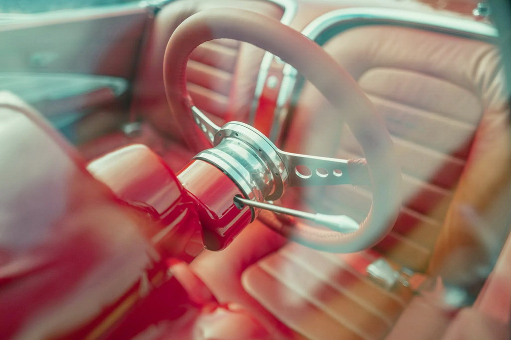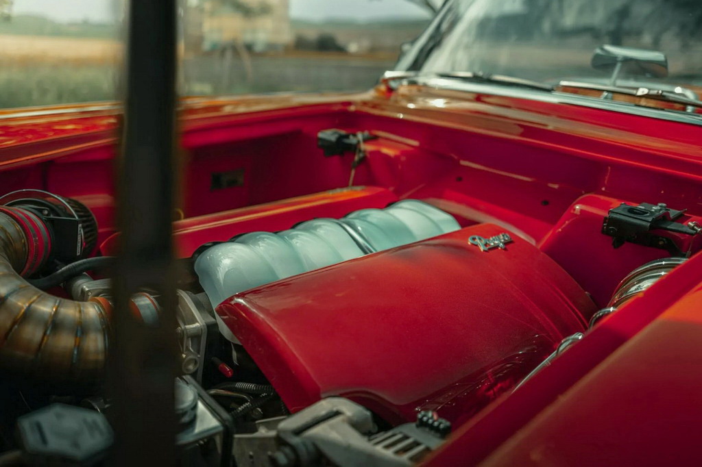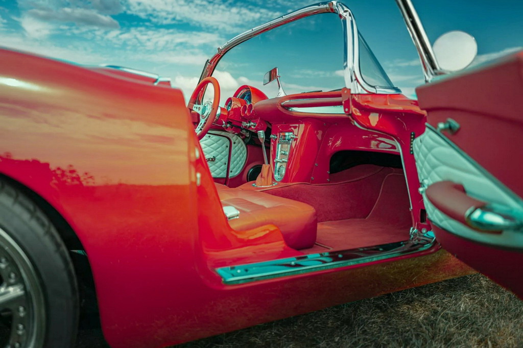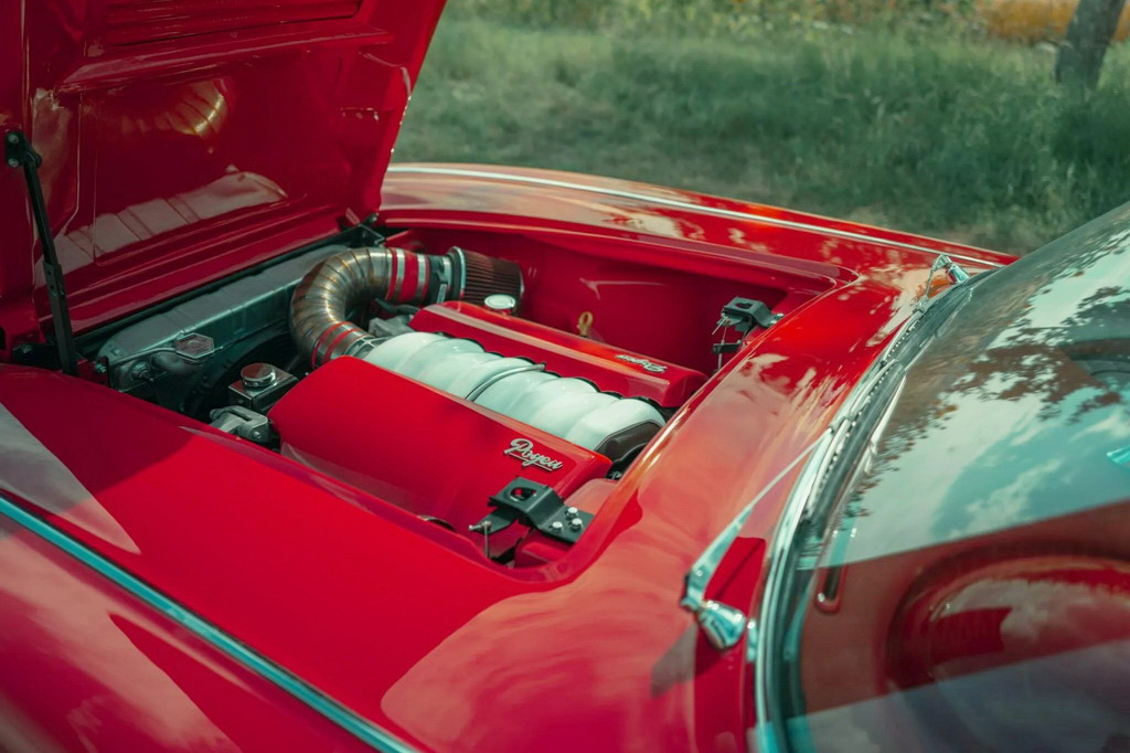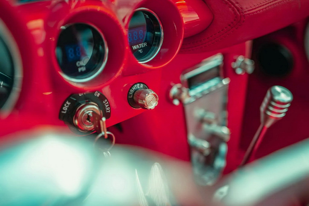 Салон также преобразили. Для отделки интерьера используется кожа красного и белого цвета, детали из полированного алюминия и Цифровые приборы Dakota Digital и новой головное устройство с усилителем JL Audio завершают модернизацию, обеспечивая как винтажный шарм, так и современный комфорт.