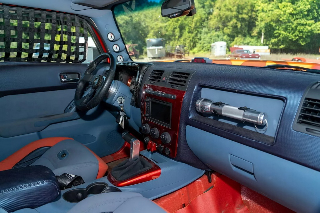 В салоне установили два гоночных кресла с пятиточечными ремнями безопасности, руль Momo, дополнительные датчики для контроля мотора, а для отделки используются декоративные элементы из карбона. На приборной панели установили переносной фонарик и информационно-развлекательную систему с GPS-навигацией. Сиденья второго ряда удалили, чтобы освободить место для большого запасного колеса.