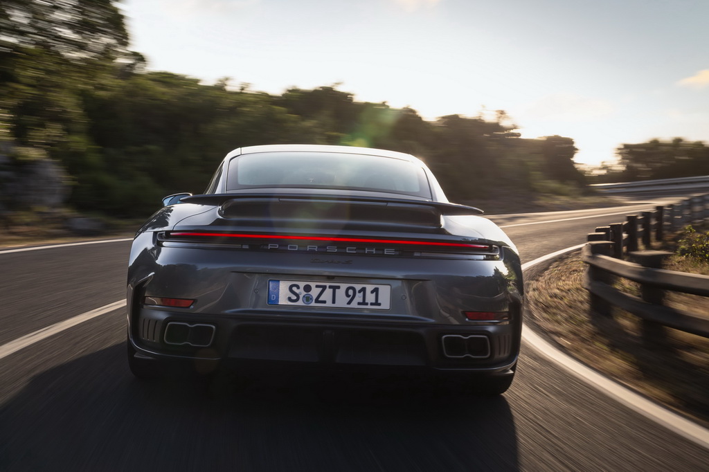 Кузов Turbo S помітно ширший за Carrera, як і колія. Вентиляційні отвори на переробленому задньому бампері додатково підкреслюють ширину автомобіля. Титанові вихлопні труби мають оновлений, але впізнаваний дизайн Turbo. Над смугою задніх ліхтарів з’явилася динамічна перламутрова вставка. Овальні титанові насадки зі спеціальною фактурою доступні опціонально. Новий Turbo S дійсно ексклюзивний, тому легко вирізняється серед усіх інших 911.