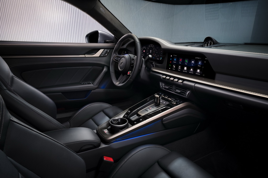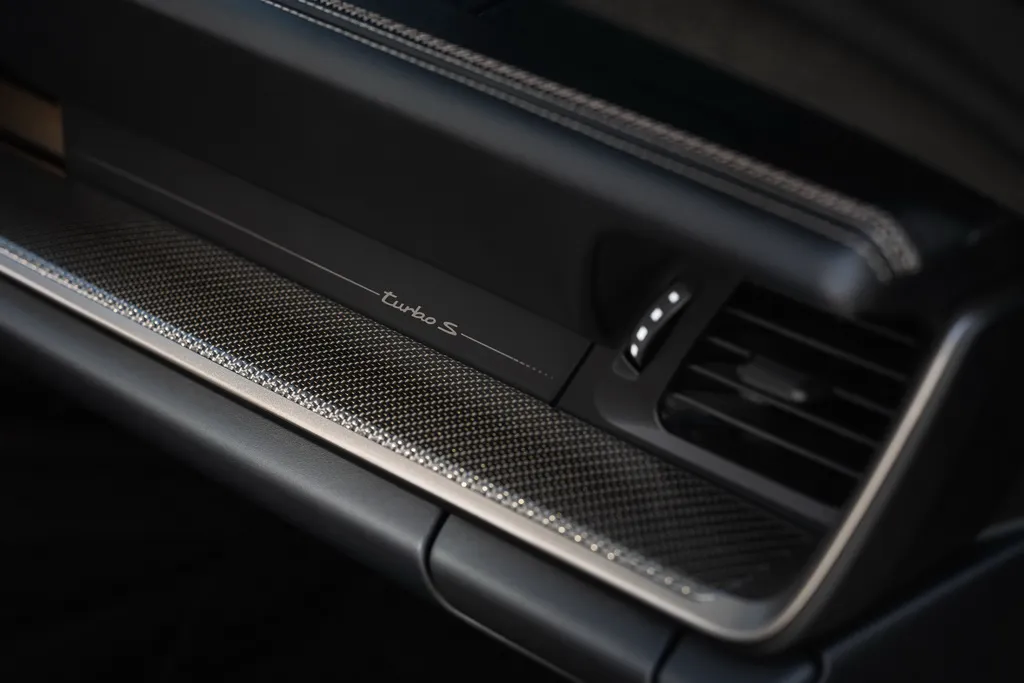 Колір Turbonite присутній в інтер’єрі: в дверних панелях, на кермі, передній панелі та центральній консолі, декоративній прострочці, годиннику Sport Chrono та приладовій панелі. Ремені безпеки та кілька кнопок на центральній консолі також розроблені у цьому кольорі. Вперше інтер’єр отримав карбонові вставки з неодимовим покриттям і стелю з перфорованої мікрофібри з чорною підкладкою. 911 Turbo S у кузові купе у стандартній комплектації постачається як двомісний автомобіль. На запит система задніх сидінь може бути замовлена без додаткової оплати. Кабріолет зазвичай постачається в конфігурації 2+2. Porsche оснащує нову модель 911 Turbo S світлодіодними головними фарами HD Matrix у стандартній комплектації. Флагманські функції освітлення підвищують безпеку під час руху вночі.