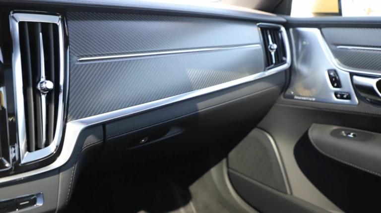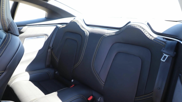 Салон отделан черной и серой кожей с декоративной золотистой строчкой. Все декоративные панели из углепластика. Ремни безопасности — желтые. В стандартном оснащении акустическая система Bowers & Wilkins и мультимедийный комплекс с дисплеем диагональю 9,0 дюймов.