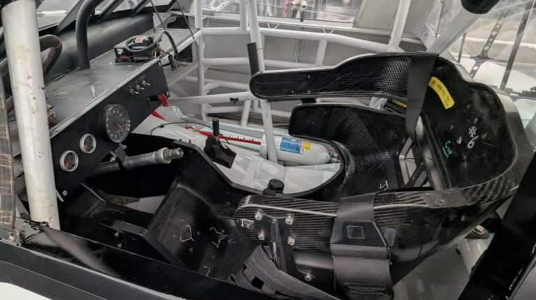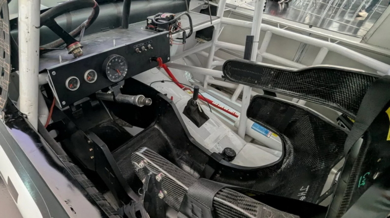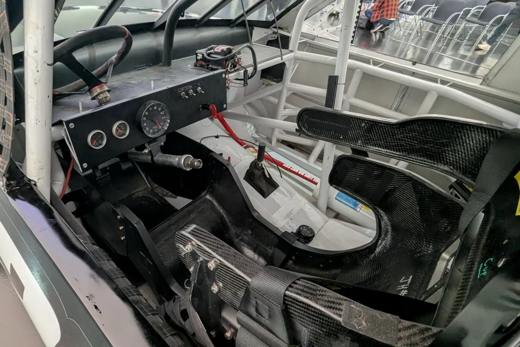 Спартанский интерьер включает минималистичную панель приборов, съемный руль, гоночное сиденье из углеродного волокна, каркас безопасности и систему пожаротушения Safecraft.