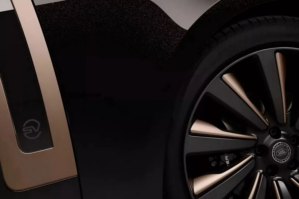 Экстерьер окрашен в насыщенный черный цвет с вкраплением красных микроэлементов, создающих эффект “мерцания”. Он сочетается с бронзовым оттенком Corinthian Bronze, который используется для отделки решетки радиатора, вставок в бамперы, боковых воздухозаборников, корпусов зеркал, багажной двери и фирменной символики, а также черными вставками Anthracite, которые напоминаю полосы тигра. В рисунке эксклюзивных 23-дюймовых кованых дисков используется комбинация бронзового и темно-серого цветов.