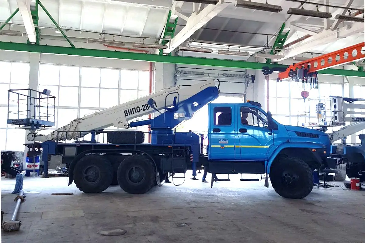 Вот такой диковинный на наших просторах автомобиль на днях поступил в сервисный центр Завода спецтехники «Техкомплект», что в Полтавской области. Это полноприводный грузовик Урал Next с двухрядной кабиной, оснащенный 28-метровым автогидроподъемником белорусского производства ВИПО. Именно из-за поломки автовышки, наработка которой составляет всего 1000 часов, машина и поступила на ремонт к украинским мастерам.