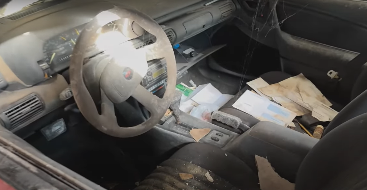 За годы простоя красный Cavalier Z24 покрылся слоем пыли и грязи, а его салон стал складом для разного мусором (пустые бутылки, упаковки от продуктов, старые газеты и прочее). Так как автомобиль вполне еще можно восстановить, то к месту вызвали специалистов детейлинг студии WD Detailing.