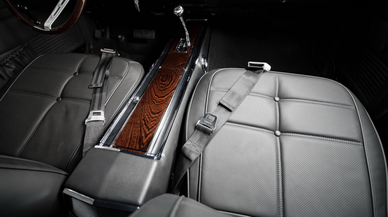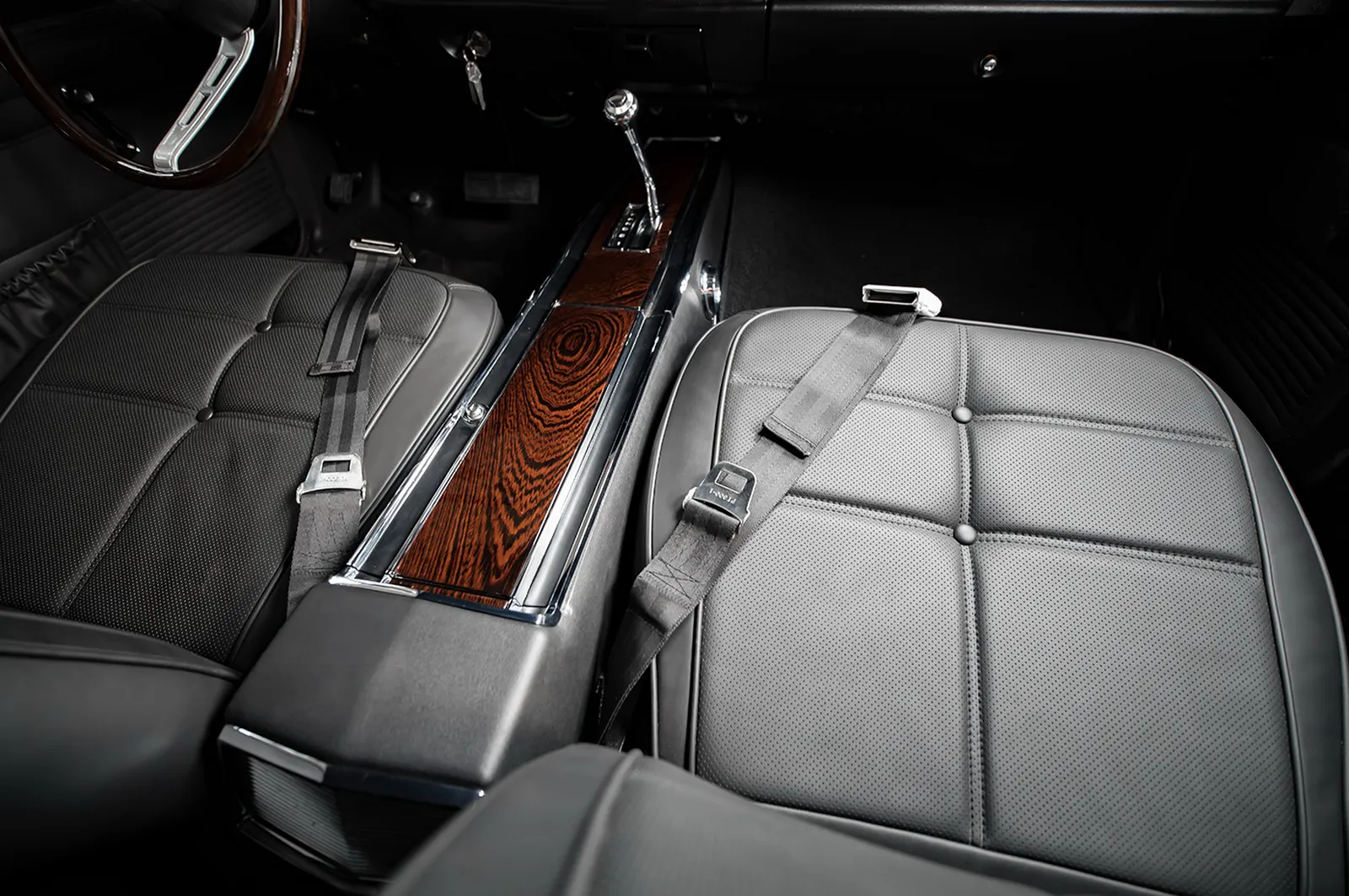 В салоне использован все тот же принцип – либо все восстанавливается, либо полностью обновляется. Автомобиль получил хорошую шумоизоляцию для большего комфорта, а сиденья были восстановлены с использованием высококачественной кожи из Италии. Рулевое колесо отличается отделкой из натурального дерева венге, как и новая центральная консоль, а дверные карты сделаны вручную из кожи.