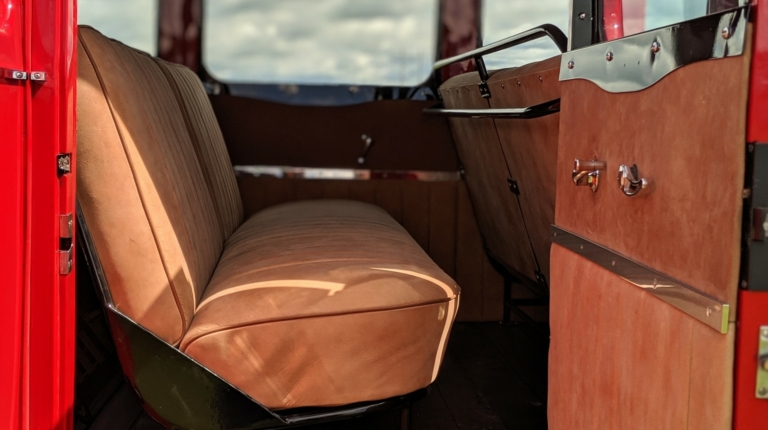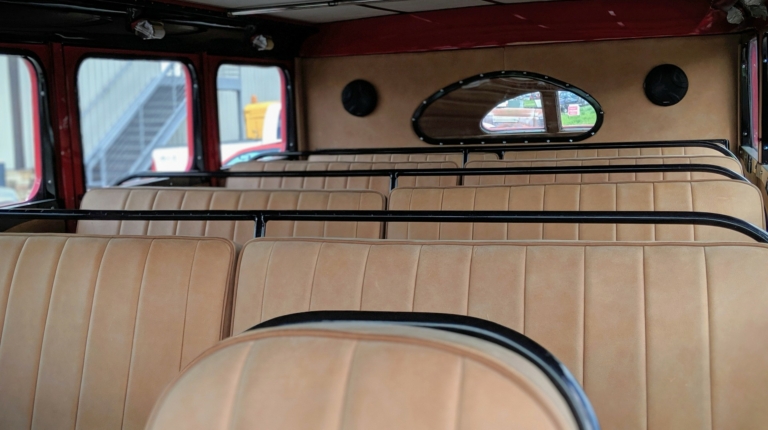 Особо много времени заняла реставрация интерьера. Здесь не только восстановили щиток приборов и оригинальные плафоны освещения, но также перетянули натуральной итальянской кожей все сиденья. Так что теперь все 18 пассажиров гарантировано обеспечены надлежащим уровнем комфорта. Такое внимание мастеров к сиденьям было вызвано еще и тем, что салон автобуса хорошо просматривается через сдвижную мягкую крышу, а посему должен иметь идеальное состояние.