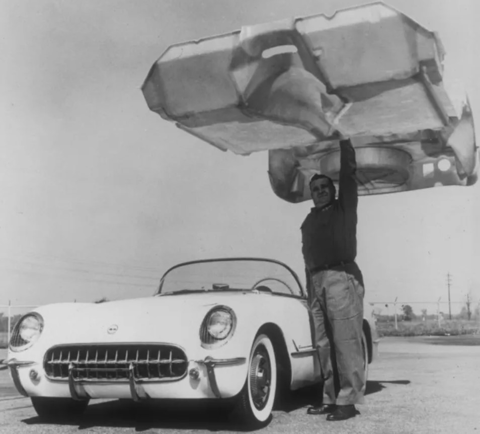 Но главное, кузов изготовили из фибергласса – полиэфирного пластика, усиленного стекловолокном. Основным его преимуществом по сравнению с металлическим считались антикоррозийная стойкость и меньший вес. Снаряженная масса автомобиля составляла 1227 кг. Вскоре прессу обошел снимок: атлет поднимает кузов Corvette… одной рукой. Конечно, это был просто рекламный трюк, но все-таки…