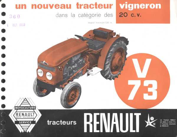 Renault V73 был построен на базе модели N73 Vigneron. Машина была заднеприводной и оснащалась 2-цилиндровым 1,4-литровым дизелем воздушного охлаждения MWM AKD 311Z мощностью 20 л. с. С ним в паре работала механическая, 6-ступенчатая коробка передач 159RLG, выпускаемая по лицензии ZF.