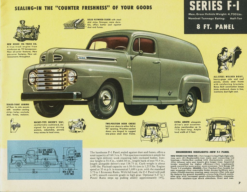 Еще в 1947 году был продан юбилейный, 5-миллионный грузовик Ford. Но еще более знаменательным стал 1948 год, когда начался выпуск машин первого послевоенного, полностью нового семейства. Оно включало в себя восемь базовых моделей – от F-1 грузоподъемностью 500 кг до «трехтонки» F-8.