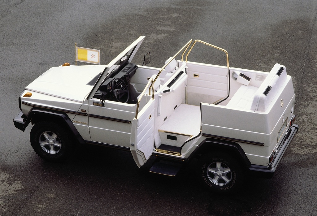 Mercedes-Benz 230 G “Popemobile” 1980 года выпуска является частью долгой, почти 90-летней истории папамобилей Mercedes-Benz. Начало ее восходит к 1930 году, когда для Папы Римского сделали автомобиль Nürburg 460 (W 08), с эксклюзивным кузовом, построенным в отделе спецкузовов в Зиндельфингене.
