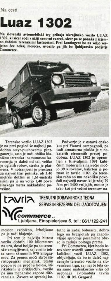 «На словенском автомобильном рынке появляется украинский автомобиль LUAZ 1302, хоть он и попадает в низший ценовой класс, однако может похвастаться исключительно хорошими ходовыми характеристиками. Первая партия, вероятно, будет доступна через несколько месяцев, а импортом будет заниматься компания Сommerce из г. Любляна.