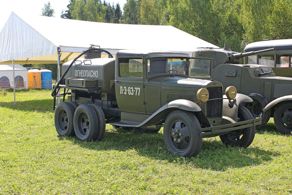Автобензозаправщик на шасси ГАЗ-ААА (6х4). Двигатель бензиновый: 4-цил., 3,28 л, 50 л. с. Ёмкость цистерны – 1500 л. Слева на корпусе цистерны – ручной подкачивающий насос, справа – ящик для наконечника шланга.