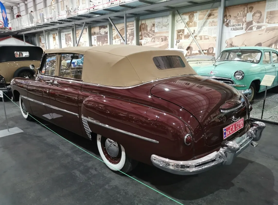 Неподалеку от него также красуется фаэтон на базе ГАЗ-12 ЗИМ. Это уже вторая такая машина в экспозиции. Причем если первая демонстрируется со сложенным матерчатым верхом, то недавно прибывшая, красивого вишневого цвета – с поднятой крышей.