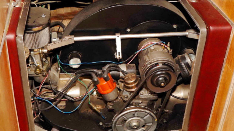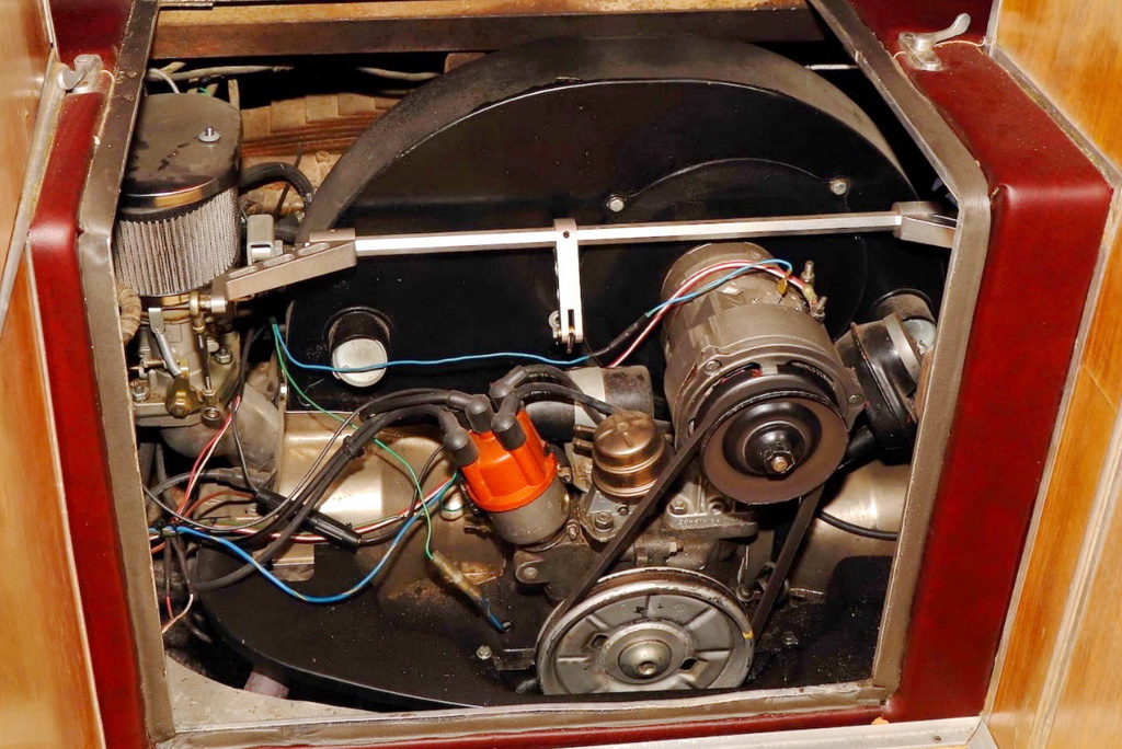 К сожалению, на данном конкретном экземпляре установлен не оригинальный мотор от Porsche 356. В описании лота указывается, что на кемпере установлен оппозитный 4-цилиндровый мотор. Он располагается под передними сиденьями и приводит в движение передние колеса через 4-ступенчатую механическую коробку передач.