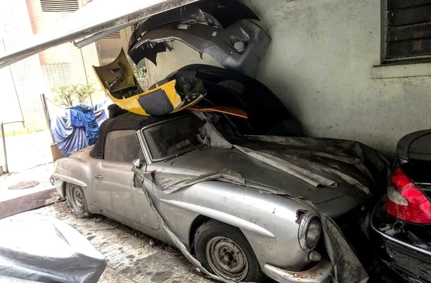 Сверху на Mercedes-Benz 190SL недальновидные инженеры автосервиса взвалили старые бамперы и другой хлам. Это привело к незначительным повреждениям кузова. Однако если посмотреть на общее состояние автомобиля, то все не так уж и плохо, и его вполне можно восстановить.