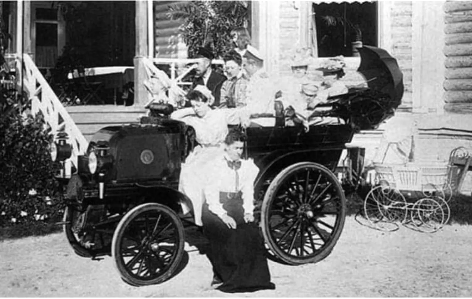 Как нам удалось выяснить, это автомобиль Daimler Phoenix c кузовом фаэтон, принадлежащий барону Н.К. фон Мекку, предпринимателю, строившему железные дороги. Фотография сделана в семейном кругу в его усадьбе в Копылово, что в Бучанском районе Киевской области. Главное здание, что интересно, сохранилось до наших дней и является главной местной достопримечательностью.