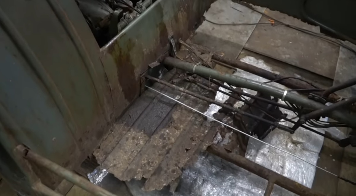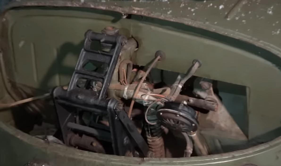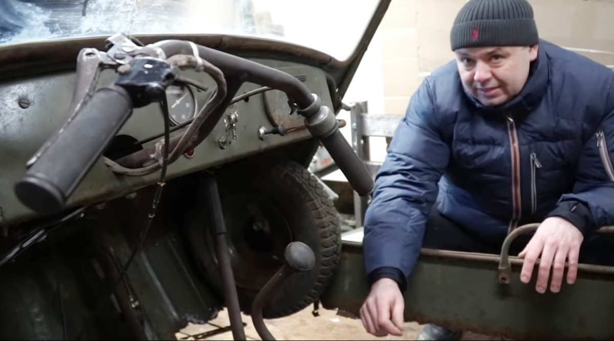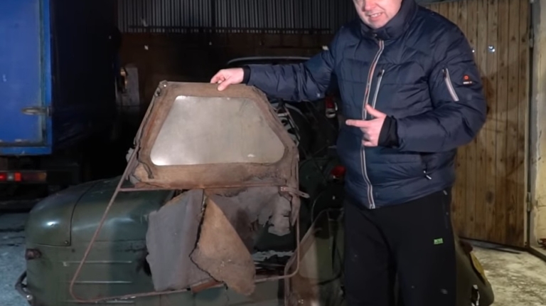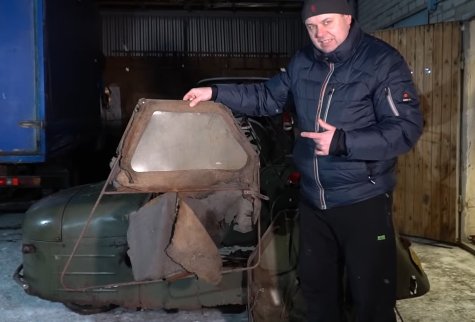 Инвалидка С1Л – в нашем случае 1954 года – была найдена буквально вросшей в землю. Машина прогнила – здесь попросту нет днища. Двери сохранились, вернее то, что от них осталось – каркас и плексигласовые окна. Изначально они были брезентовые. Двери имеют уникальные замки – тканевые пели (как снаружи так и внутри), одеваемые на специальные металлические штыри.