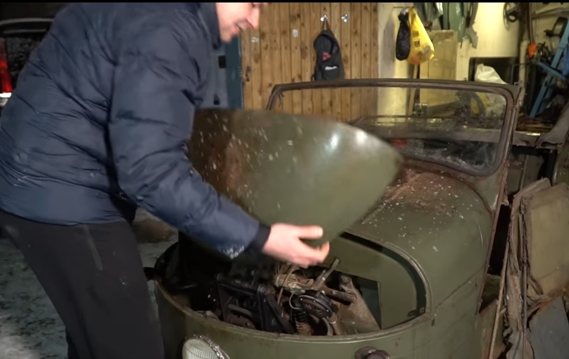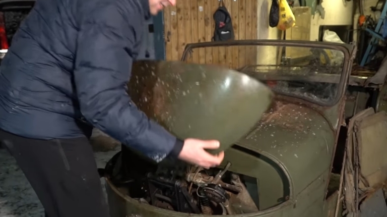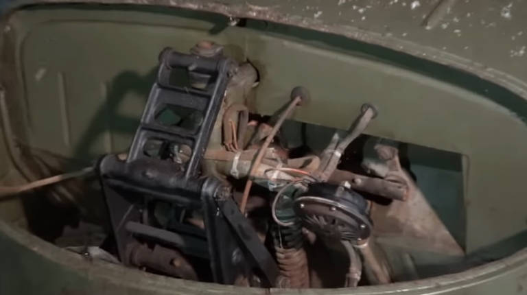 Инвалидка исправно заводится – мотоциклетный двигатель находится сзади. Доступ к нему через небольшую распашную дверцу в корме. Мотор от мотоцикла М1А – он же «Москва». Интересно, что глушитель выходит вбок – это говорит, что это машина раннего выпуска.