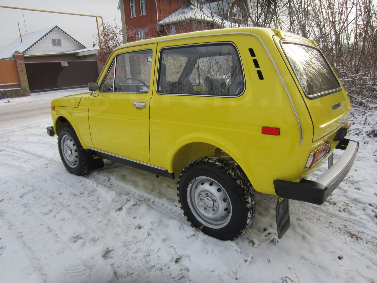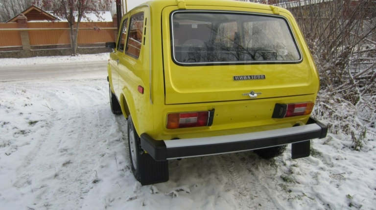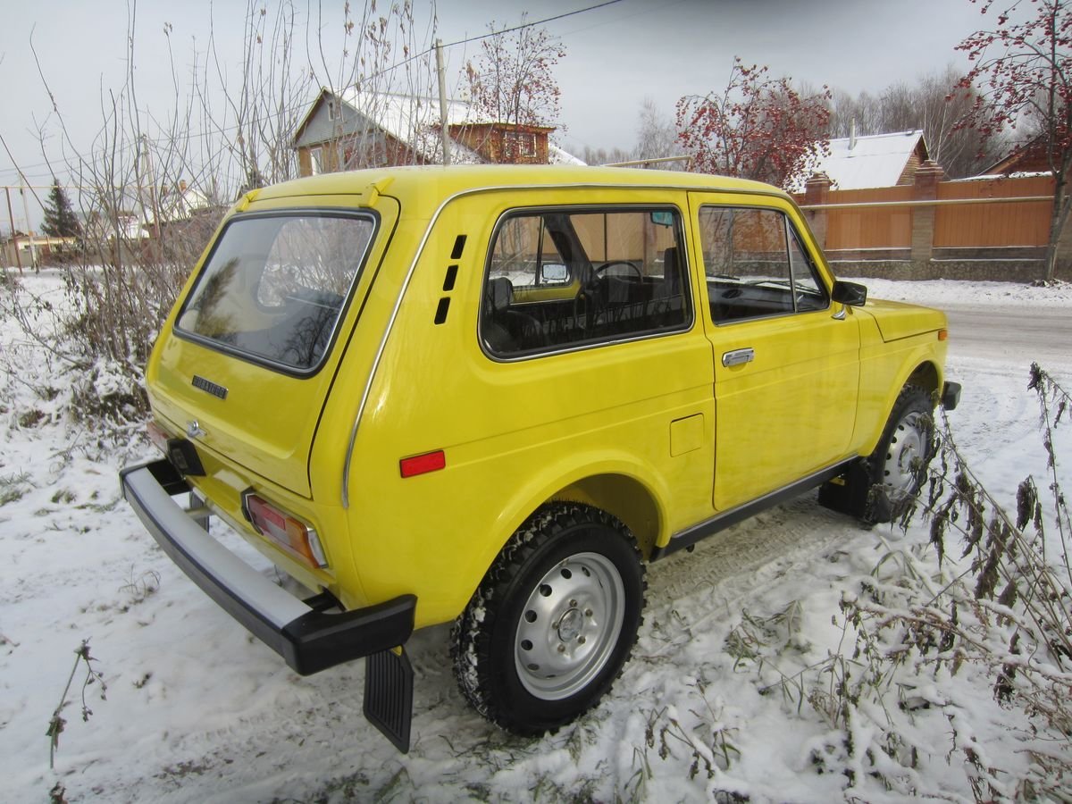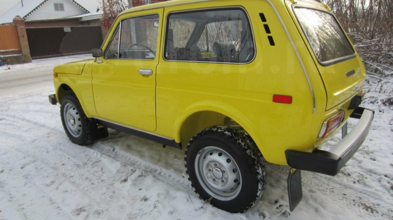 Данный внедорожник сохранил все атрибуты, присущие Нивы первых годов выпуска. У него серебряный кант радиаторной решетки, прямоугольные красные катафоты по бокам сзади, хромированные корпуса зеркал, молдинги на порогах и др. Окрашена машина в ярко-желтый цвет.