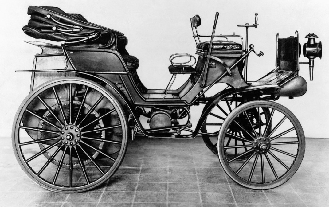 На фото праворуч: Готліб Даймлер та Вільгельм Майбах в авто Daimler-Riemenwagen (1897 р.)