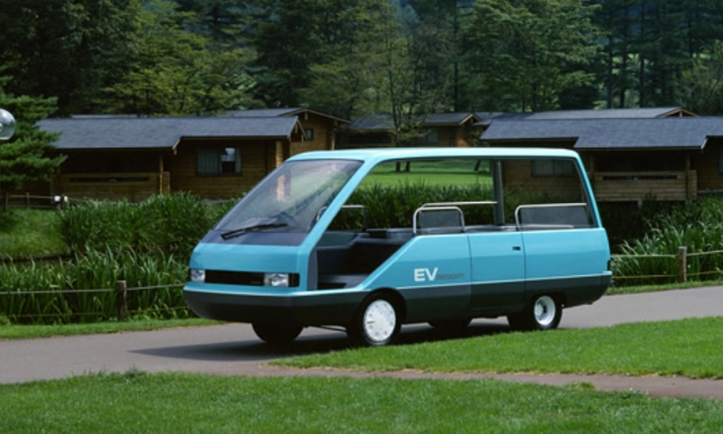 Затем вновь были годы забвения электротемы. А может накопления сил и багажа технологий. И вот, в 1985 году появился новый электро-концепт, который назывался очень незамысловато - EV. Это был прогулочный автомобильчик с небольшим запасом хода(60 км) и черепашьей максмальной скоростью(16 км/час). Несколько таких были выпущены и использовались на предприятиях компании как транспорт для перевозки VIP-гостей по территории.