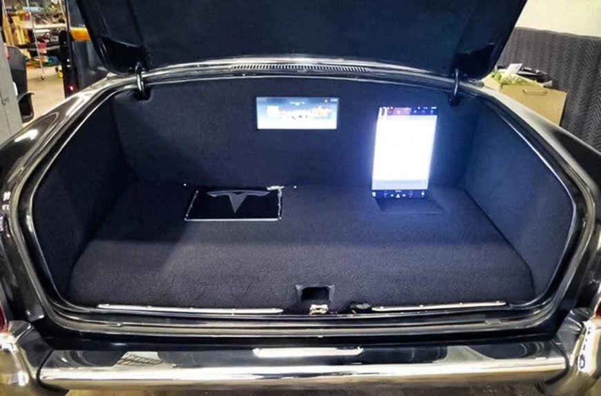 Так как тюнеры старались сохранить седану максимально аутентичный вид, электромотор пришлось установить под днищем. Там же разместили и аккумуляторную батарею емкостью в 75 кВтч. Подкапотное пространство, в котором ранее размещался двигатель, теперь выполняет функцию багажника. В стандартном же багажном отсеке разместили экран мультимедийной системы и цифровую приборную панель. На такой шаг специалисты ателье пошли для того, чтобы не менять внутренее оснащение салона и оставить его оригинальным.