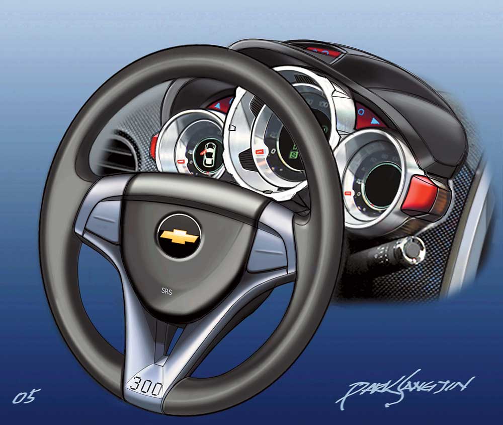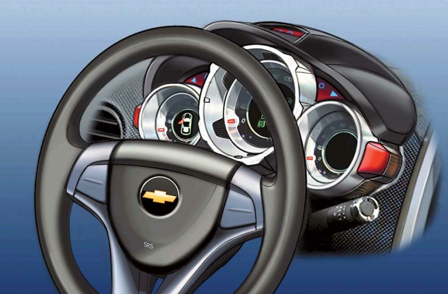 Т. К.: Стилистика агрессивного кузова Cruze нашла отражение и в салоне, для которого выбрана концепция сдвоенного кокпита, применявшаяся в легендарной спортивной модели Corvette. Такое решение будет подчеркнуто дверными картами с цветными вставками, светодиодными приборами и мягким пластиком отделки. Дизайн панели приборов разрабатывался при помощи компьютерного моделирования и трехмерной графики.