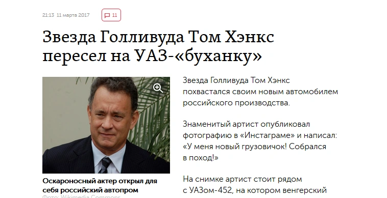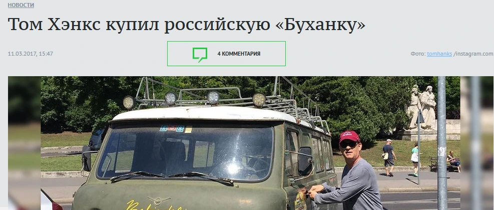 Пребывая в Венгрии, Том Хэнкс сфотографировался возле УАЗ-452 и выложил снимок в Instagram. «У меня новый грузовик! Я собираюсь в поход!», - написал киноактер.
