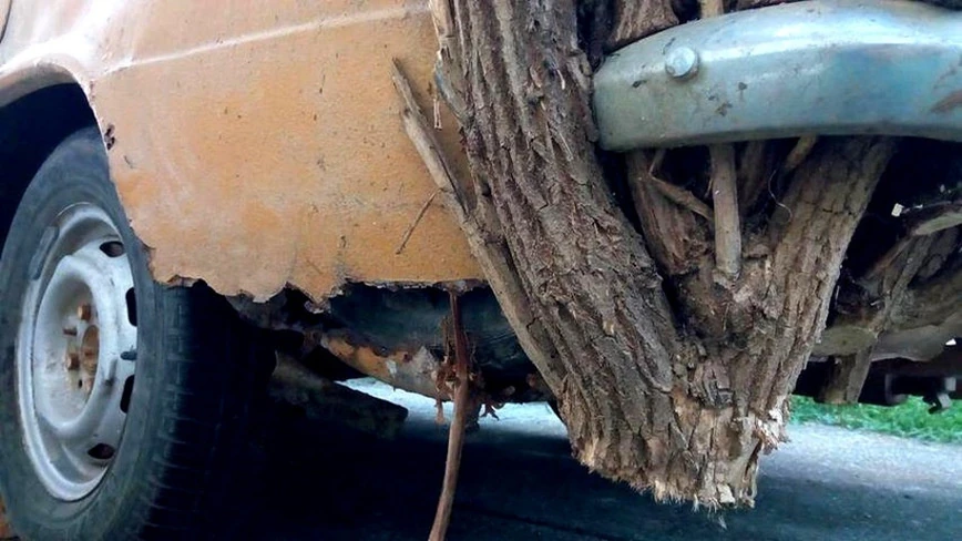 Только представьте, что машину пришлось буквально вырубывать и выпиливать из зеленого плена деревьев. Причем одно из деревьев ювелирно проросло между задним бампером и кузовом.