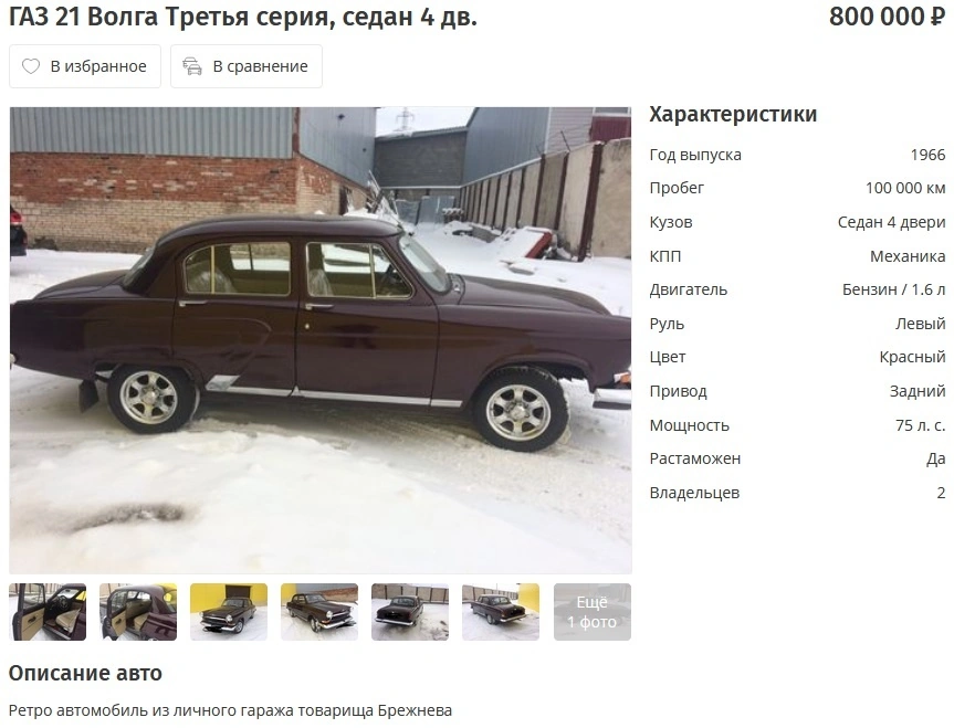 Так, недавно на одном из интернет-ресурсов по продаже автомобилей появился интересный лот в виде ГАЗ-21 Волга поздней, третьей серии. Машина 1966 года выпуска, судя из объявления, принадлежала лично Брежневу. Автомобиль в отлично отреставрированном состоянии с пробегом всего 100 тыс. км предлагается почти за бесценок – всего 800 тыс. рублей или 12 тыс. долларов.