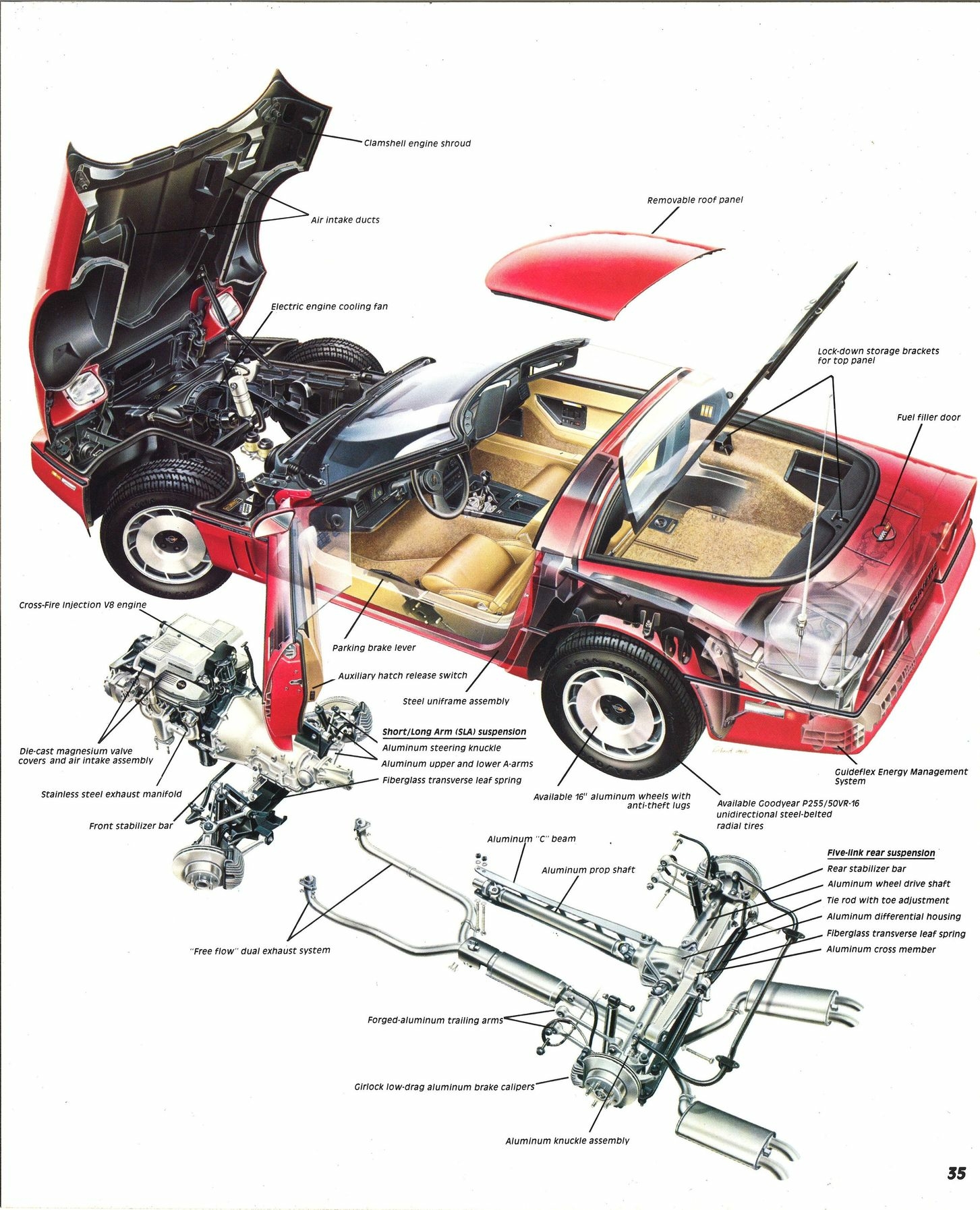 Для улучшения управляемости и снижения веса подвеску колес изготовили из алюминия. Спереди и сзади применили многолистовую поперечную рессору их стекловолокна, которая была в три раза легче винтовых пружин.