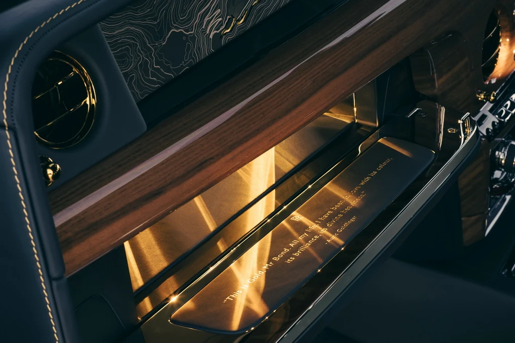 Основание передней и задней центральных консолей также отделано изысканной золотой отделкой, как и внутренняя часть перчаточного ящика. Внутренняя крышка перчаточного ящика также украшена тиснением культовой цитаты Голдфингера: «Это золото, мистер Бонд. Всю свою жизнь я был влюблен в его цвет, его блеск, его божественную тяжесть».