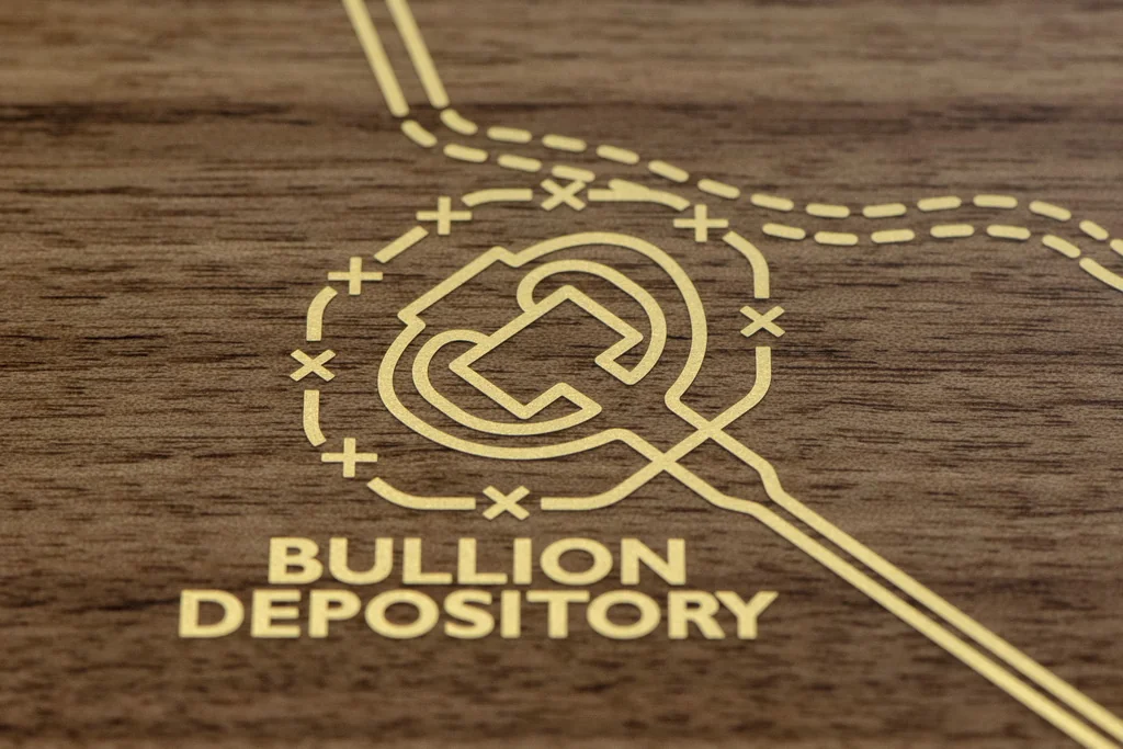 Столики для пикника Royal Walnut украшены инкрустацией из 22-каратного золота глубиной всего 0,1 мм, на которой изображена вымышленная карта Форт-Нокса, хранилища слитков, где хранятся золотые запасы Соединенных Штатов.