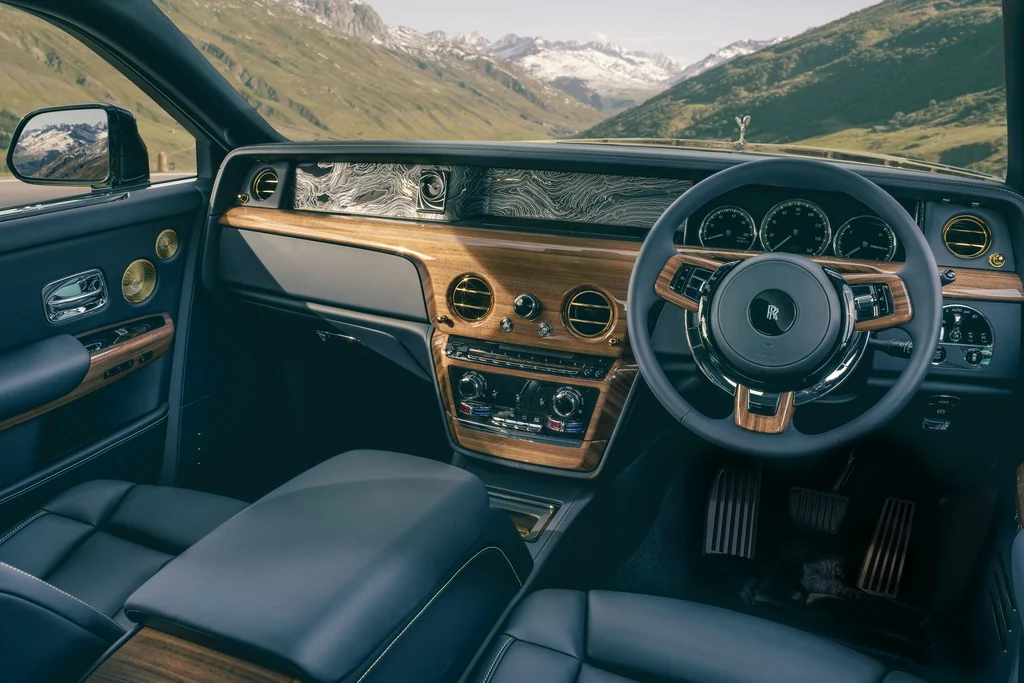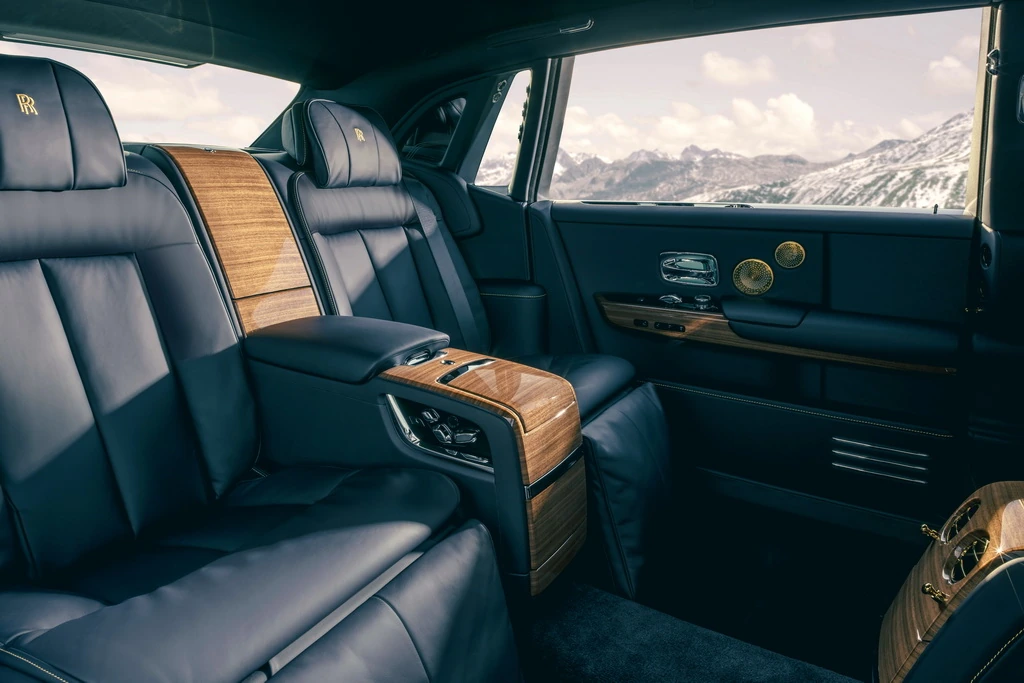 Phantom Goldfinger отделан темно-синей кожей и шпоном Royal Walnut, выбранными в качестве элегантного и изысканного холста для демонстрации золотых деталей, вдохновленных цветовой гаммой интерьера оригинального автомобиля 1937 года. Сиденья, в том числе откидывающиеся сиденья Serenity в задней части салона, отделаны золотистой строчкой и подголовниками с золотистыми монограммами «RR».