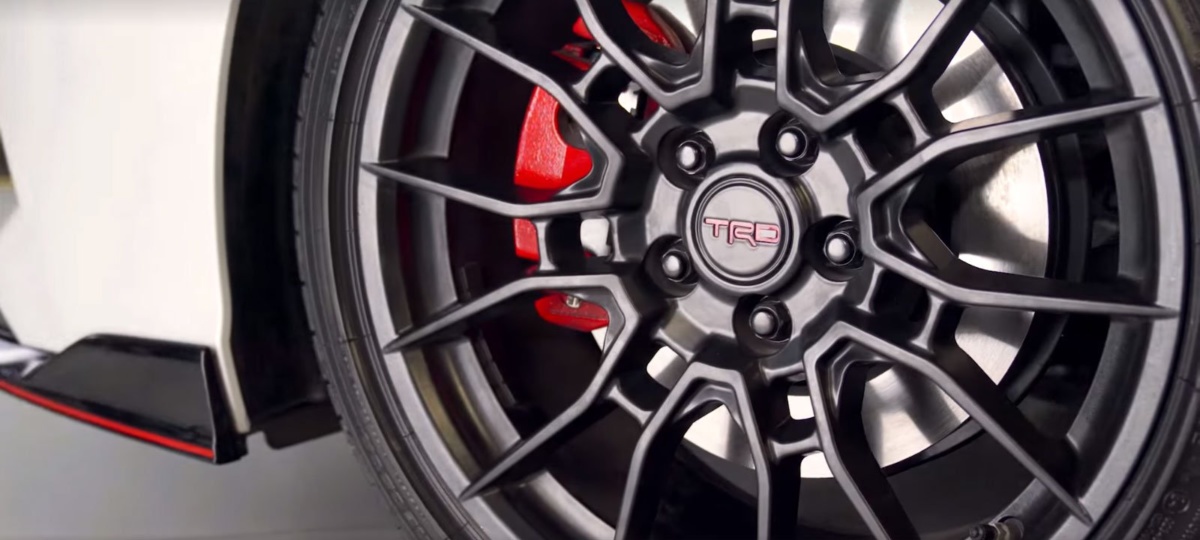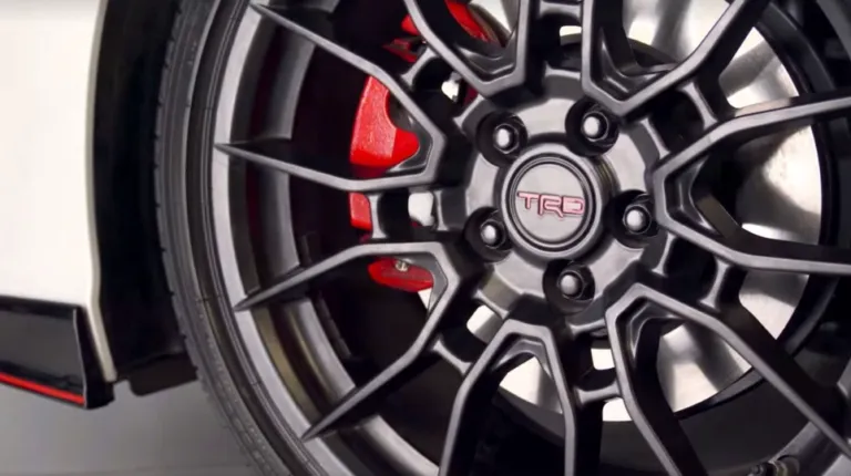 Крыша окрашена в черный цвет, а внутри нас встречает красно-черная отделка с контрастной строчкой и вышитыми на подголовниках кресел логотипами TRD. Ожидается, что в такой модификации Тойота Камри получит 3,5-литровый V6 мощностью 300 л.с., но компания пока не раскрыла характеристики.