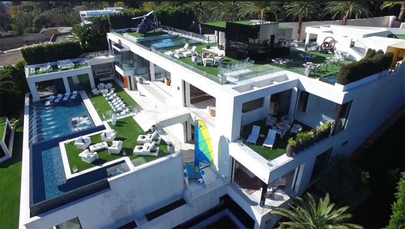Огромный дом включает 12 спален, 26 ванных комнат и три кухни. Кроме того, предусмотрены сразу шесть баров, массажный салон, спортзал, винные погреба, домашний кинотеатр, несколько бассейнов.