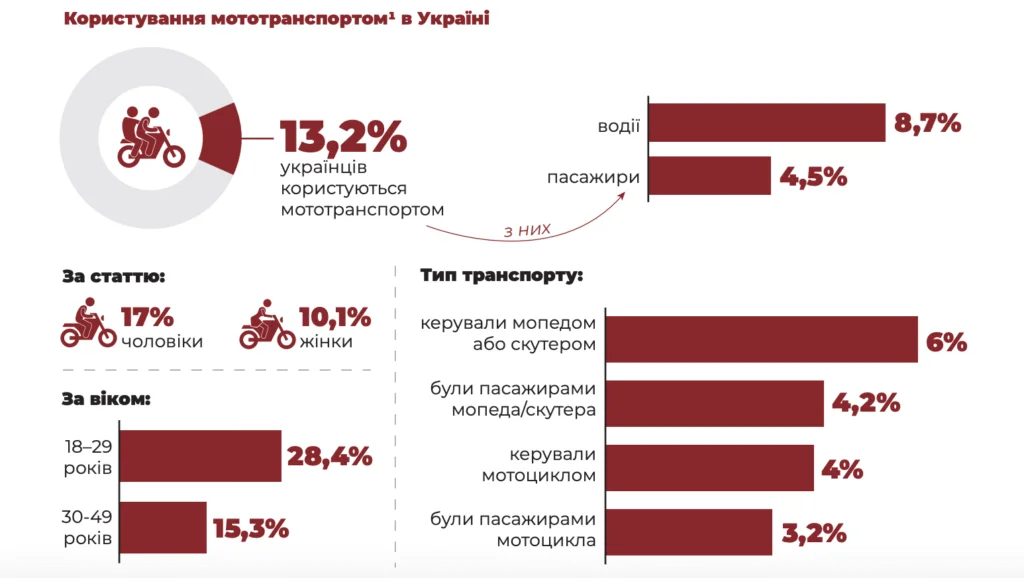 Україна не відстає від світової тенденції росту популярності приватного транспорту, зокрема й мотоциклів та мопедів, особливо у великих містах. За офіційними даними Міністерства внутрішніх справ, продажі мотоциклів і мопедів в Україні зросли майже в половину з 2020 по 2024 роки. А кожен восьмий українець, за опитуванням КМІС, з початку 2025 року користується мототранспортом — більше 8,5% як водії та 4,5% як пасажири. Найактивніше мотоцикли, мопеди й скутери використовує молодь: 28% серед респондентів віком 18–29 років, 15% — віком 30-49 років.
