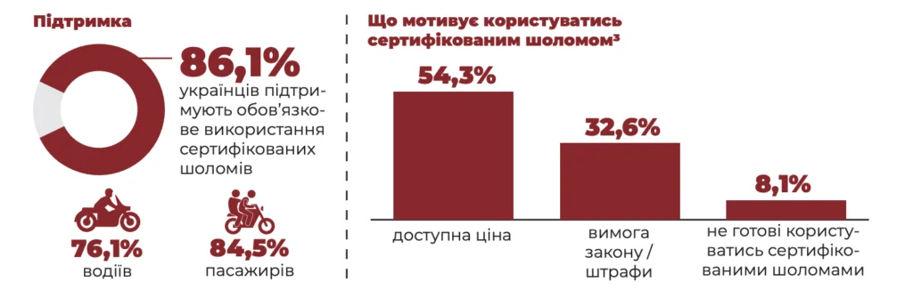 Серед головних мотиваторів використання сертифікованих шоломів респонденти називають доступну ціну (54,3%) та вимогу закону або штрафи (32,6%). Лише 8,1% опитаних заявили, що не готові користуватись сертифікованими шоломами.