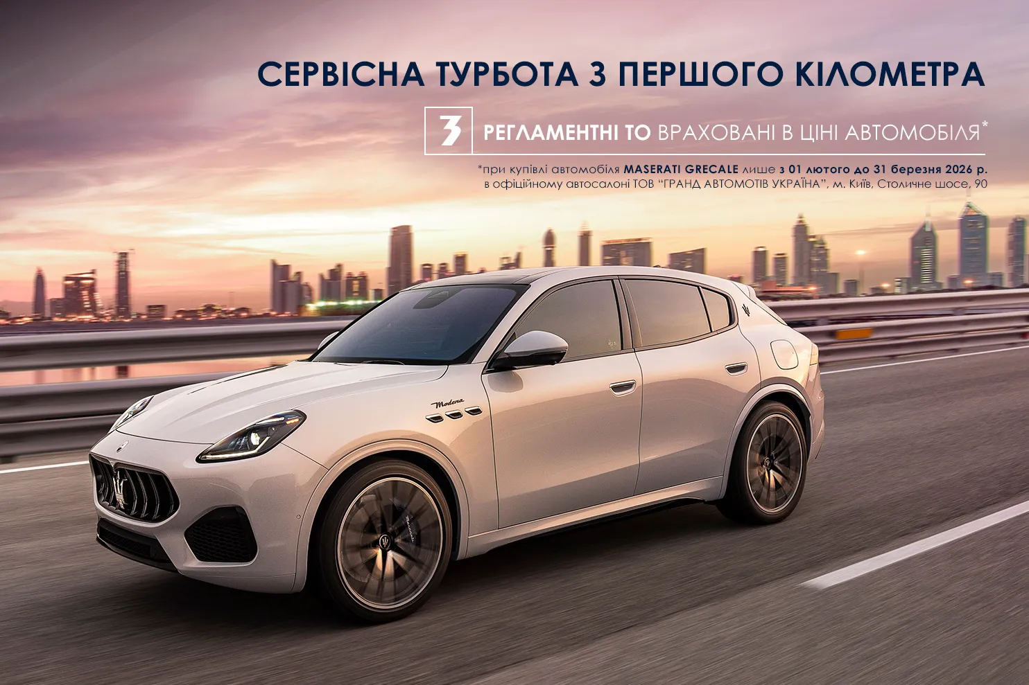 Відтепер, при купівлі нового автомобіля Maserati Grecalе, в період дії «Спеціальної пропозиції», а саме з 01 лютого до 31 березня 2026 року, за договором купівлі-продажу – три планові регламентні технічні обслуговування виробника вже включені у вартість авто, що виконуються сертифікованими спеціалістами з використанням оригінальних запчастин та матеріалів. Це гарантує збереження високих стандартів якості, надійності та безпеки, які є невід’ємною частиною філософії Maserati.