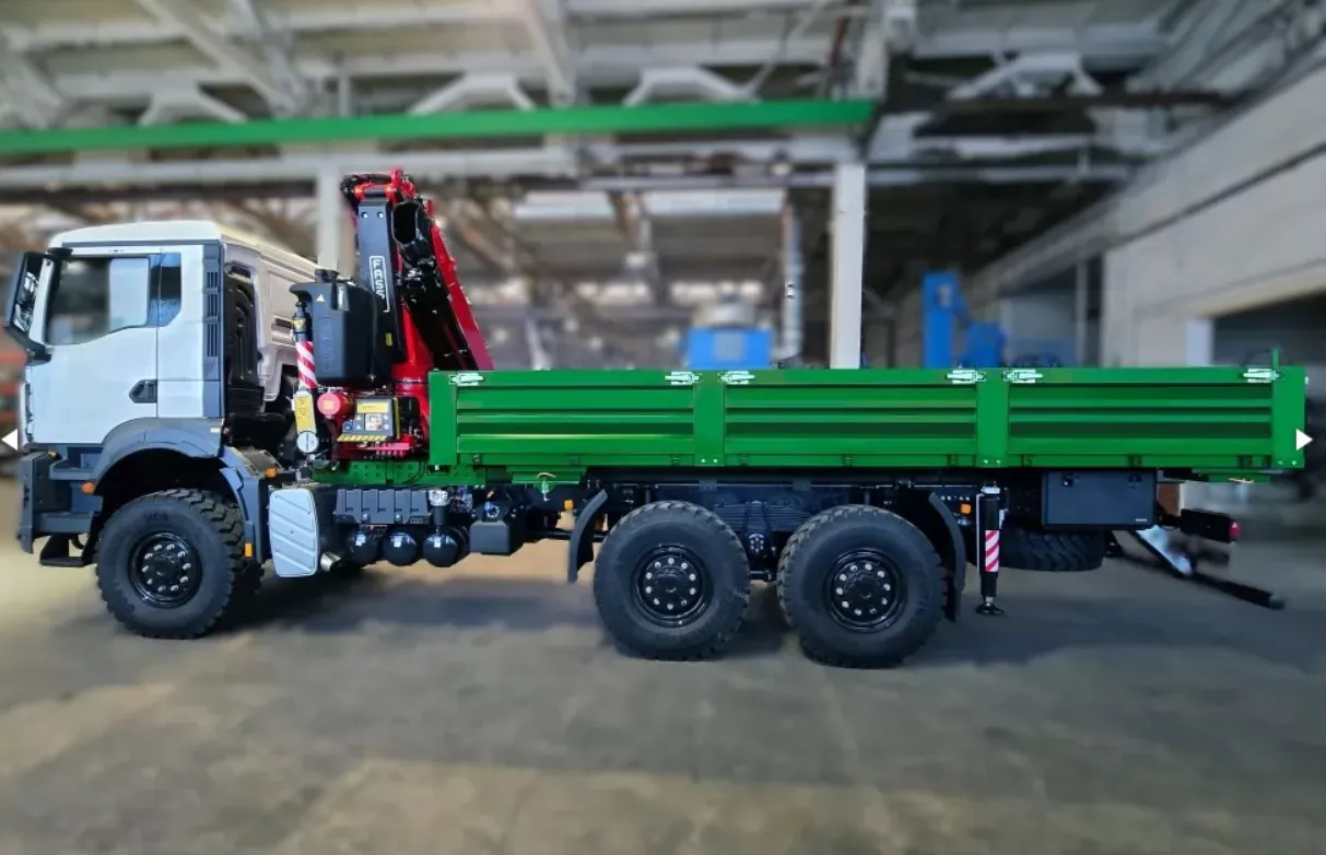 Завод спецтехники «Техкомплект» на днях изготовил еще один бортовой автомобиль с краном-манипулятором – TK-TGS-КМ-365 на полноприводном шасси MAN TGS 33.400 (6х6). На нем установлен стальной кузов собственного производства – длиной 6060 мм, шириной 2500 и высотой 600 мм. Платформа оснащена откидными бортами, быстросъемными боковыми стойками и имеет рифленый стальной пол.