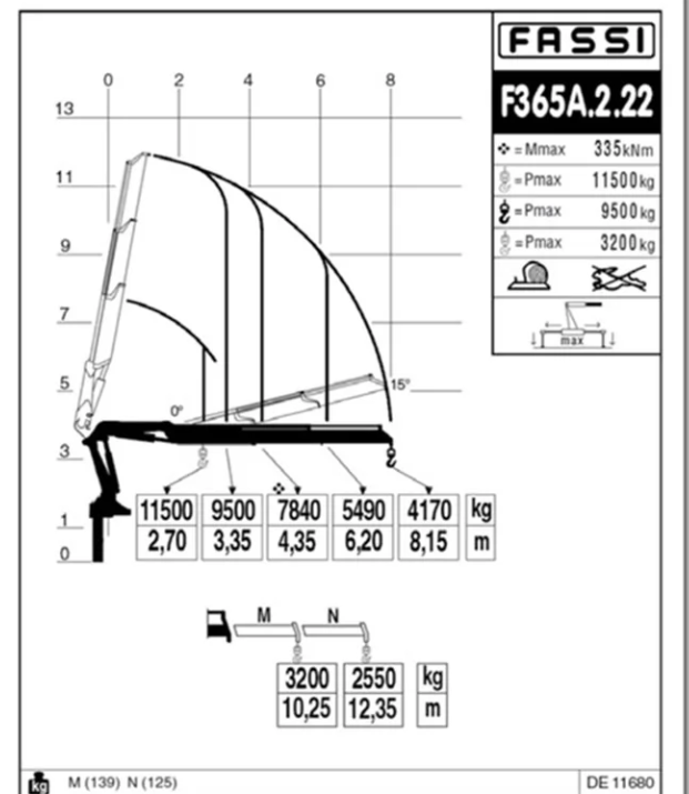 За кабиной установлен кран-манипулятор Fassi F365A.2.22 c грузовым моментом 34,15 тм. Его двухсекционная стрела на минимальном вылете 2,7 м может поднимать до 11,5 т, а на максимальном 8,15 м грузоподъемность составляет 4,17 т. Угол поворота стрелы составляет 400 град. Масса оборудования – 3,35 т.