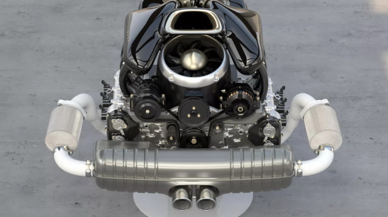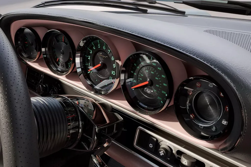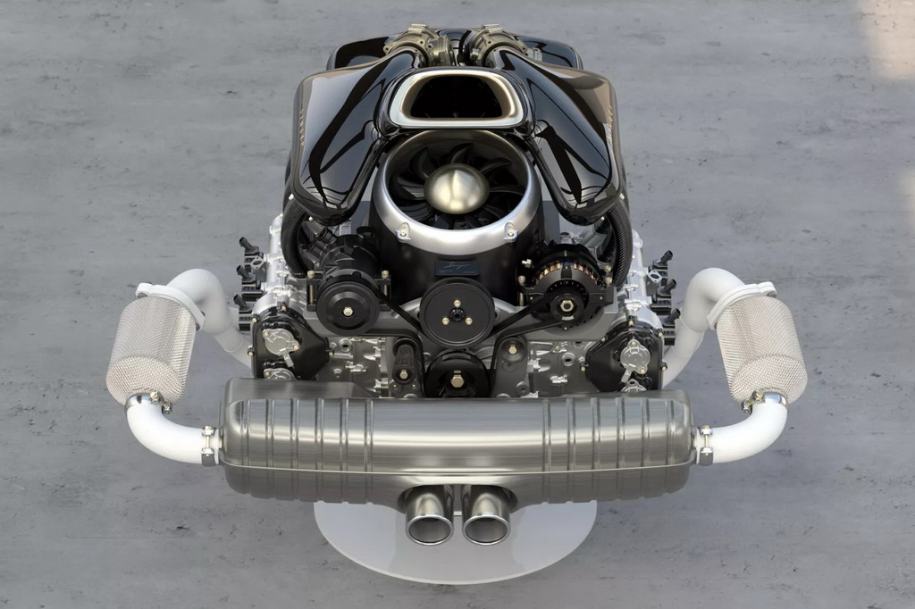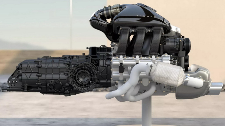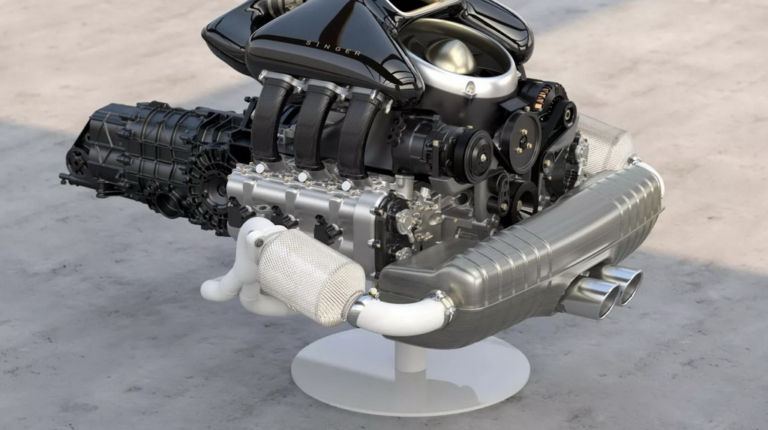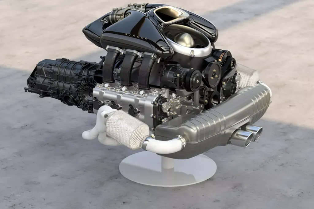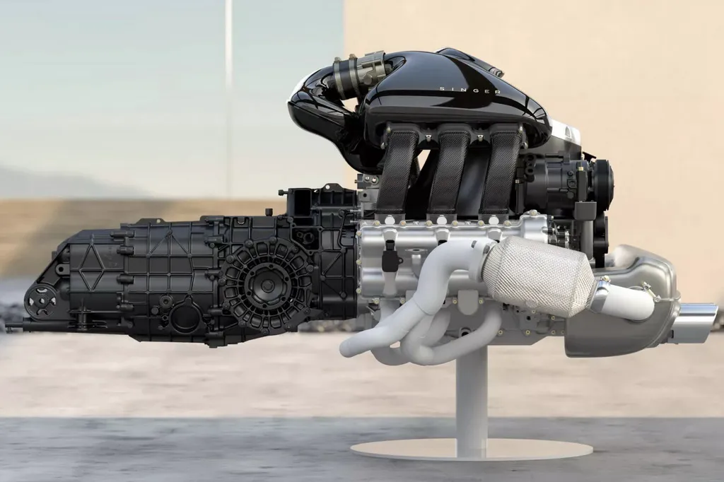 Вместо двухтурбинного оппозитного шестицилиндрового двигателя Singer устанавливает 4-литровый атмосферный агрегат с водяным охлаждением, четырехклапанными головками и изменяемыми фазами газораспределения. Разработанный совместно с Cosworth, двигатель развивает мощность 426 л. с. В паре с ним работает шестиступенчатая механической коробке передач, а привод осуществляется на задние колеса.