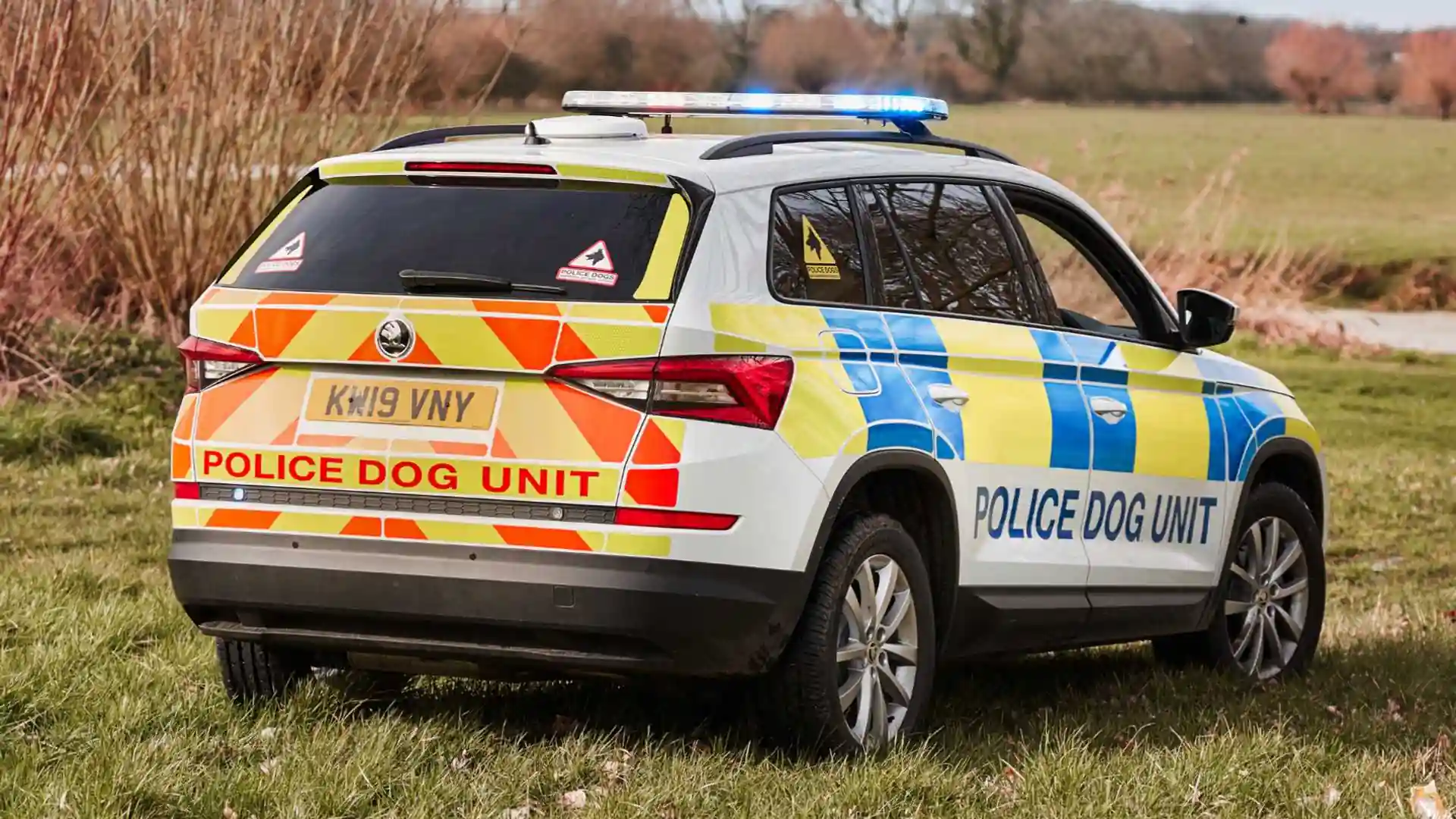 Кузов Kodiaq «для собак» окрашен в полицейскую ливрею с сине-желтыми полосами по бокам. Кроссовер оснащен 360-градусной системой аварийного освещения и системой блокировки работы двигателя. Последняя позволяет использовать заглушенный мотор как генератор для питания ламп или компьютера.