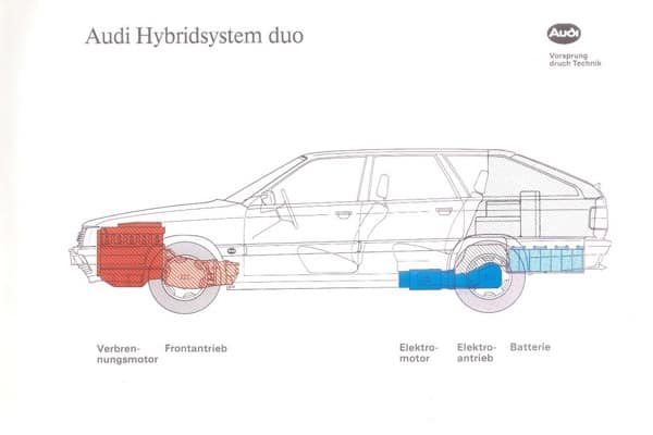 А на следующем Франкфуртском автосалоне – 1991 года дебютировала уже более совершенная машина Audi Duo. Она уже получила фирменную систему постоянного полного привода Quattro. В качестве основного силового агрегата здесь служил 4-цилиндровый двухлитровый 114-сильный бензиновый мотор. А вот электродвигатель мощностью 21 кВт когда было нужно приводил в движение задние колеса. В чисто электрическом режиме привод на передние колеса отключался, и машина могла разгоняться до 65 км/ч. Запас хода до 80 км обеспечивали натрий-серные аккумуляторы.