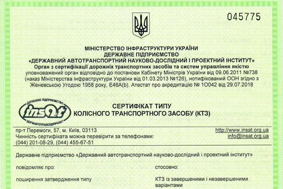 По результатам проведенных сертификационных работ Органом по сертификации ГП «ГосавтотрансНИИпроект» (г. Киев) «АвтоКрАЗу» оформлено и выдано Сертификат утверждения типа № UA*46A(b)*0182*05 от 17.10.2019 г.