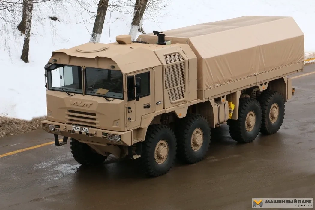 Прежде всего, отметим новый дизайн кабин колесных тягачей, приведенный под единый фирменный стиль Volat Line. Об этом красноречиво говорят характерные выштамповки на носовой части. Их можно видеть на моделях от мало до велика, начиная от МЗКТ-5002 (4х4) до тягача-танковоза МЗКТ-741351 (8х8).