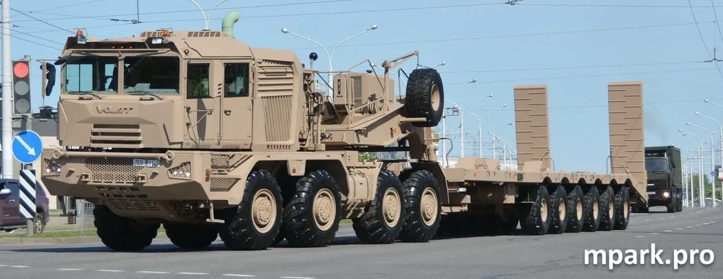 А вообще самым эффектным танковозом считается МЗКТ-741351, который недавно был поставлен в ОАЭ. Отметим, что вышеперечисленные многоосные модели превышают дорожный габарит по ширине и отличаются торсионной подвеской всех колес.